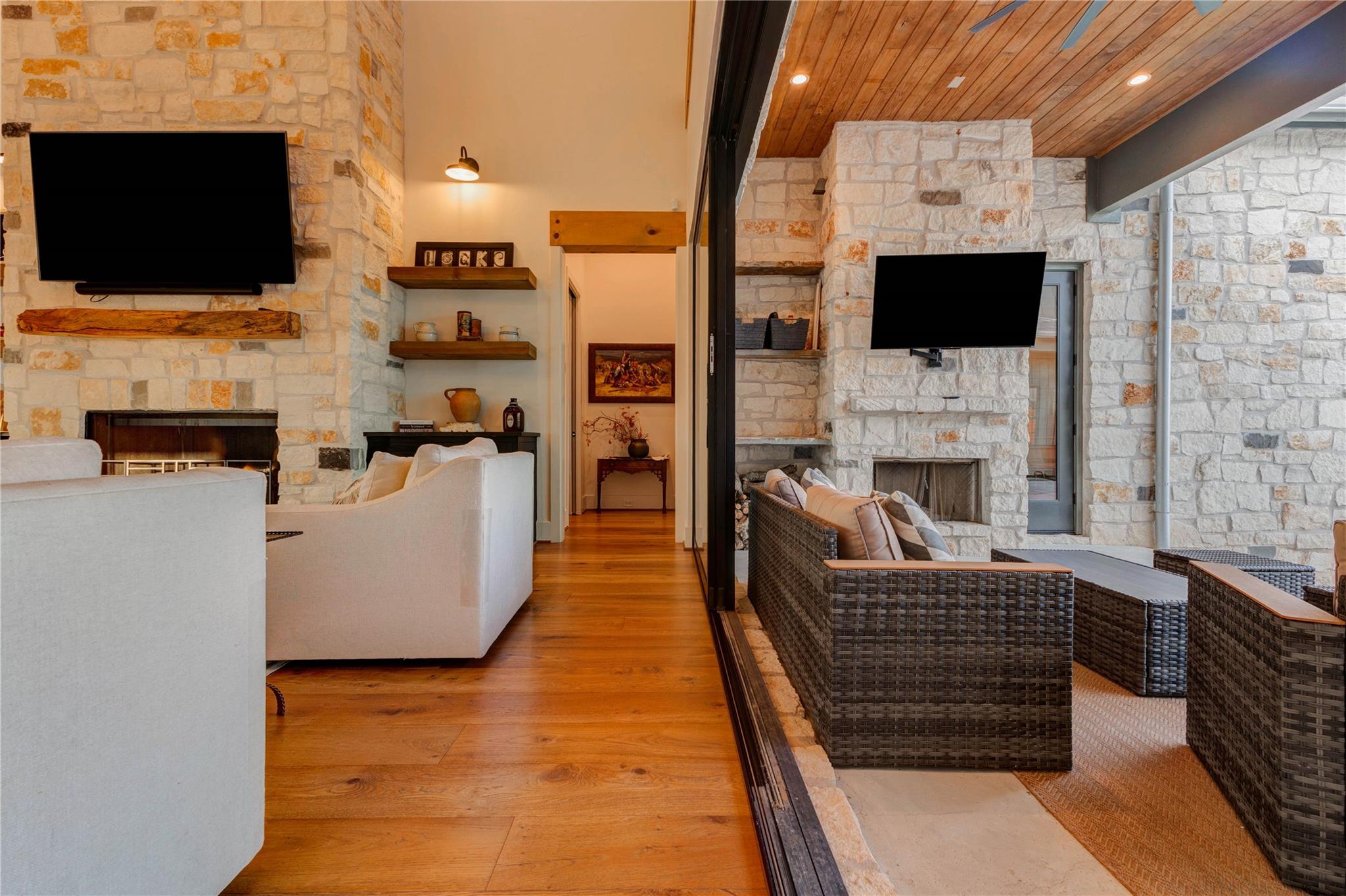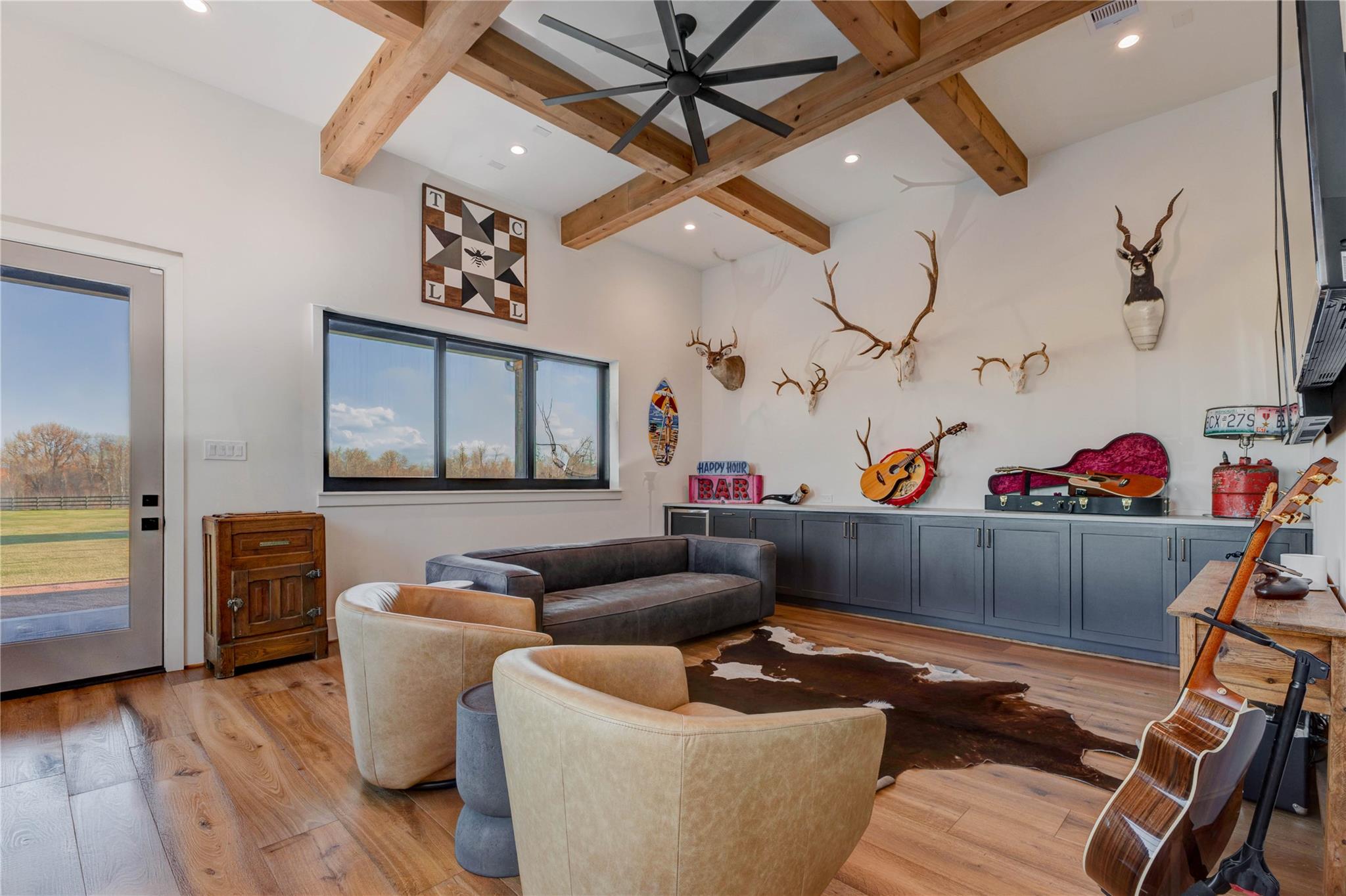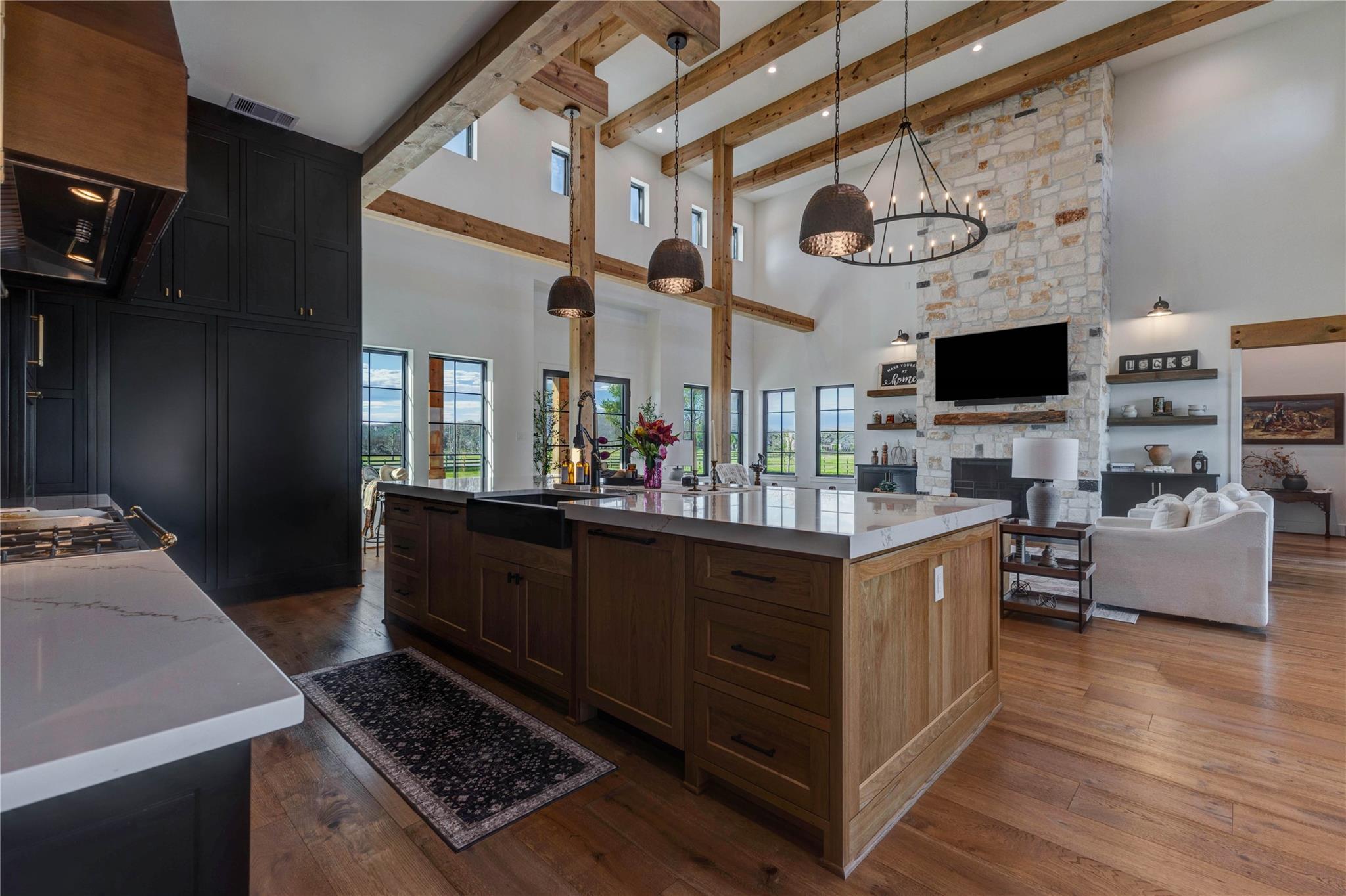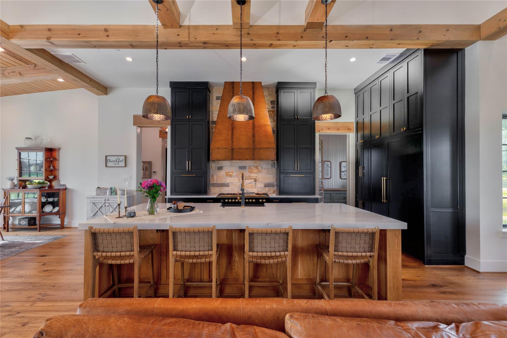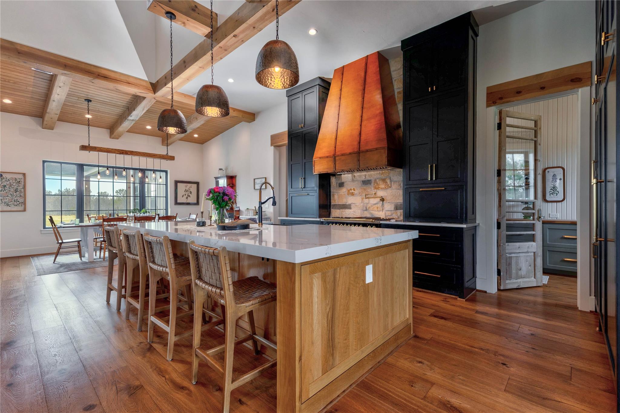Experience riverside luxury in this Fairmont Custom Home estate on 5.7 acres in Fulshear’s Fulbrook neighborhood. This 4,996 sq ft Modern Farmhouse connects seamlessly w/the Brazos River. Quality begins at the electric gate w/copper gas lanterns & Hill Country stone accents carried indoors. European Oak floors flow throughout (no carpet) & designer lighting illuminates every room.The chef’s kitchen features custom White Oak cabinets & a 48” ILVE dual-fuel range. There is a spacious yet discrete prep kitchen, entered via 8ft antique Italian church doors, includes double ovens, ice maker & bev fridge.The primary suite offers a spa retreat w/a stone-walled tub.Practical perks include a 4-car garage w/dog wash & AC dog room. Outside, enjoy a heated pool w/waterfalls, spa & private river access via a rear double gate.Features a built-in LP grill, wine center & 1,200 sq ft unfinished space above the garage for a guest suite. This luxurious yet quaint property.7